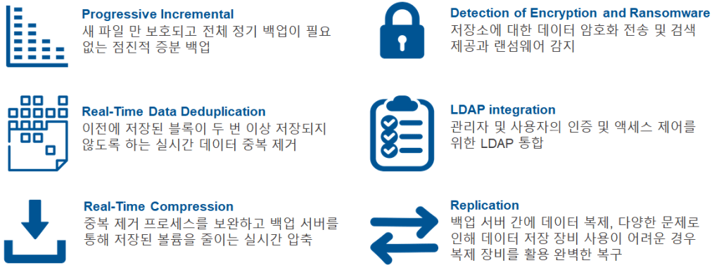 Spectrum Protect는 정책기반의 자동화된 통합 스토리지 보호 솔루션이며 다음의 기능을 통해 전산 데이터를 보호합니다.